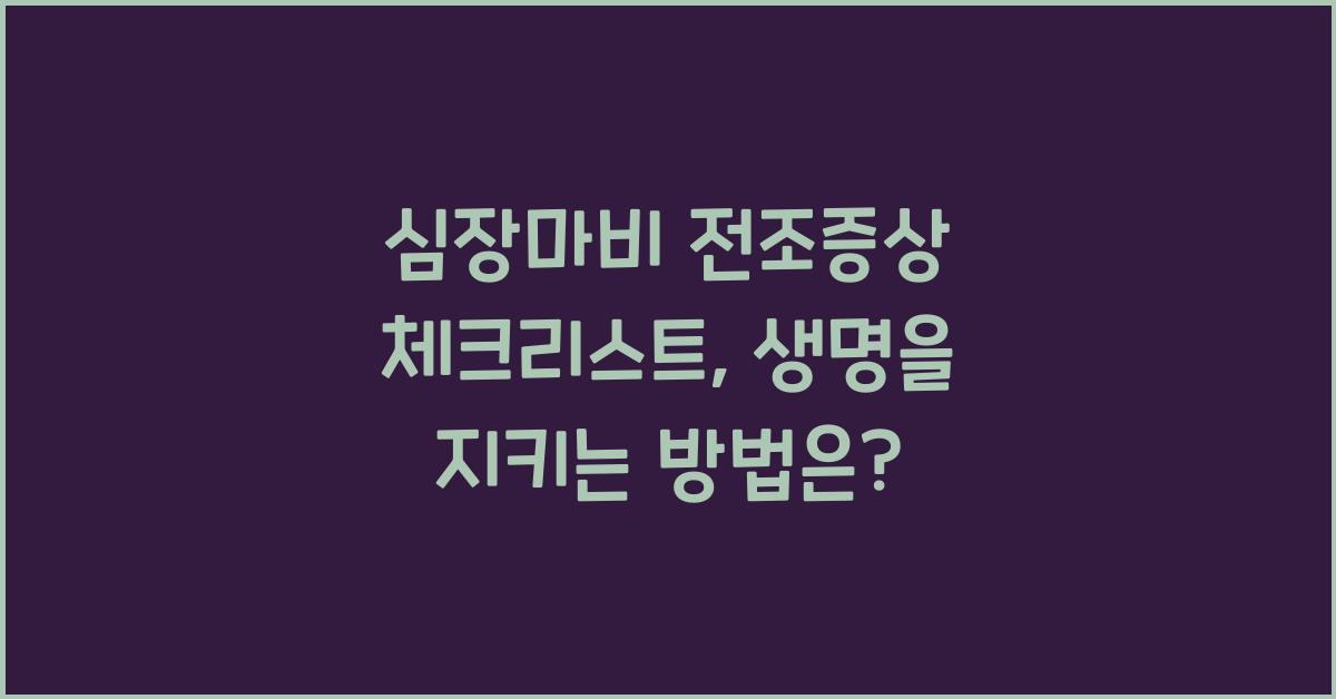 심장마비란 무엇인가?심장마비는 심장이 갑자기 기능을 멈추는 상태로, 생명을 위협하는 긴급상황입니다. 많은 사람들이 심장마비를 '단순한 통증'으로 치부하지만, 이는 엄청난 위험을 내포하고 있습니다. 심장은 우리의 몸속에서 매우 중요한 역할을 하므로, 어떤 증상이라도 무시하지 말아야 합니다. 예를 들어, 가슴 통증이나 압박감이 느껴진다면 이는 심장마비가 발생할 수 있다는 신호일 수 있습니다.심장은 산소와 영양분이 포함된 혈액을 전신에 공급하는 역할을 합니다. 이 기능이 중단되면 생명에 직결되는 상황이 발생할 수 있습니다. 따라서 심장마비의 전조증상을 아는 것이 매우 중요합니다. 그리고 이를 사전에 인지하고 행동에 옮기는 것이 생명의 열쇠가 될 수 있습니다.심장마비 전조증상 체크리스트심장마비 전조증상 체크리스..